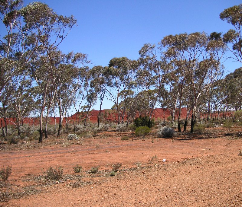 Ohne Baum und ohne Wasserloch zieht sich der lange Outback Track durch die australische Hitze, die schnell mal über 45 Grad erreichen kann, um dann nachts am Gefrierpunkt zum Stillstand zu kommen. Während die größeren Teile des Outbacks farblich von unzähligen Eukalyptus Bäumen und Buschwerk mit ihren grün-silbern schimmerndem Blattwerk – teils wie Olivenbäume – auf purpurotem Sand geprägt sind, herrscht hier roter, gelber und weißer Sand auf Kalksteinboden vor, der partiell unterbrochen wird von Büschen und kleinen Hecken.