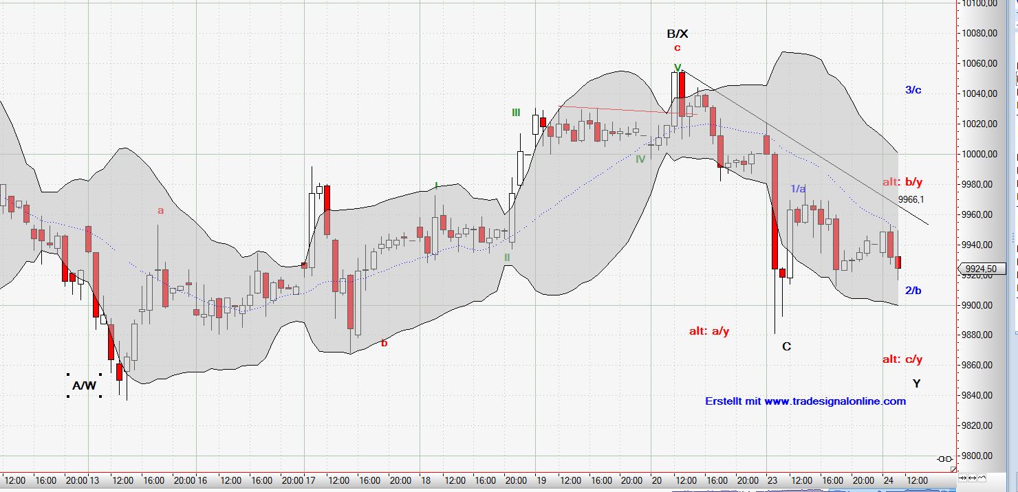 Der gestrige Handelstag könnte eine längerfristige Konsolidierung eingeleitet haben. Allerdings ist nach wie vor eine Fortsetzung des – in charttechnischer Sprache – sich ausbildenden bärischen Keils denkbar. Für unseren kurzfristigen Elliott-Wellen-Count heisst dies, daß wir zunächst die impulsive Variante mit sofort weiter steigenden Kursen ausschliessen können. Welche der 16 in der EW-Theorie herausgearbeiteten Korrekturformen sich ausbilden wird, werden uns die kommenden Strukturen verraten.