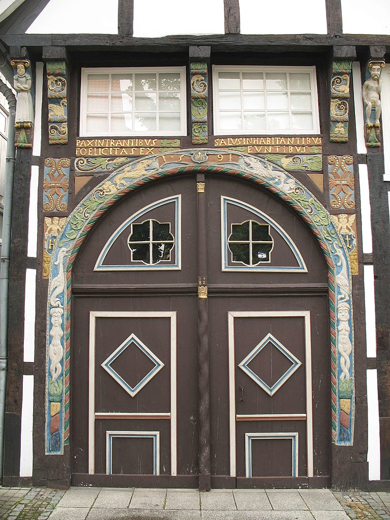Lange Straße 88. 1592 bezeichnet. Am Giebel Taubandknaggen, der Torbogen und die Schwelle mit Ranken beschnitzt.
