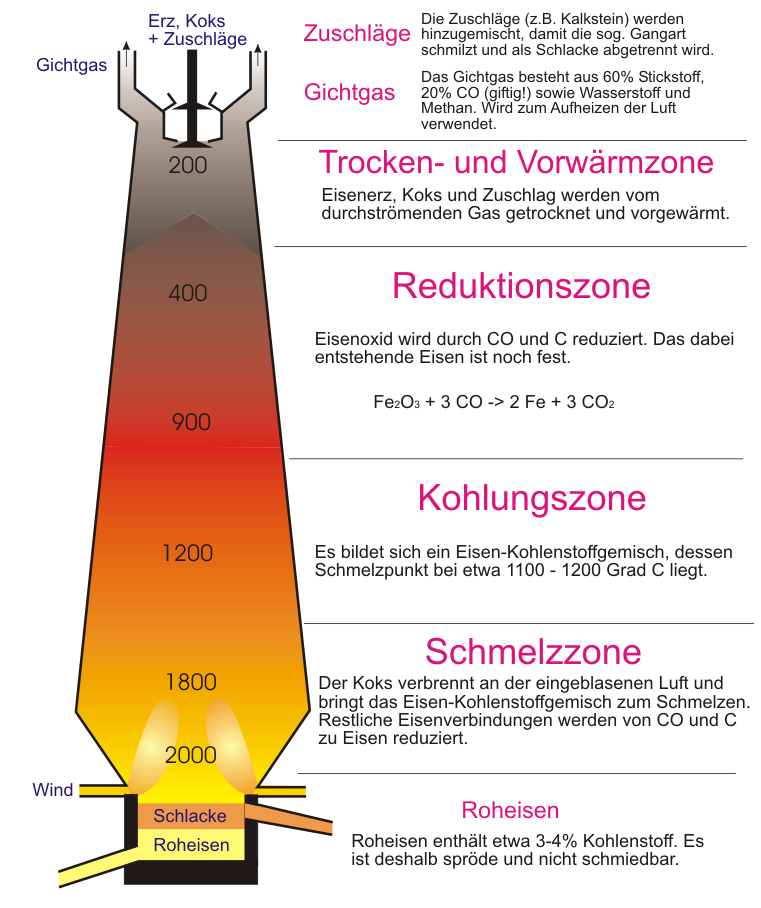 Der schichtweise mit aufgegebene Koks diente als Energieträger und Reduktionsmittel und der über mehrere Düsen eingeblasene Heißwind lieferte den für die Verbrennung des Kokses nötigen Sauerstoff, um die manchmal benötigten 2.000 Grad Celsius zu erreichen.