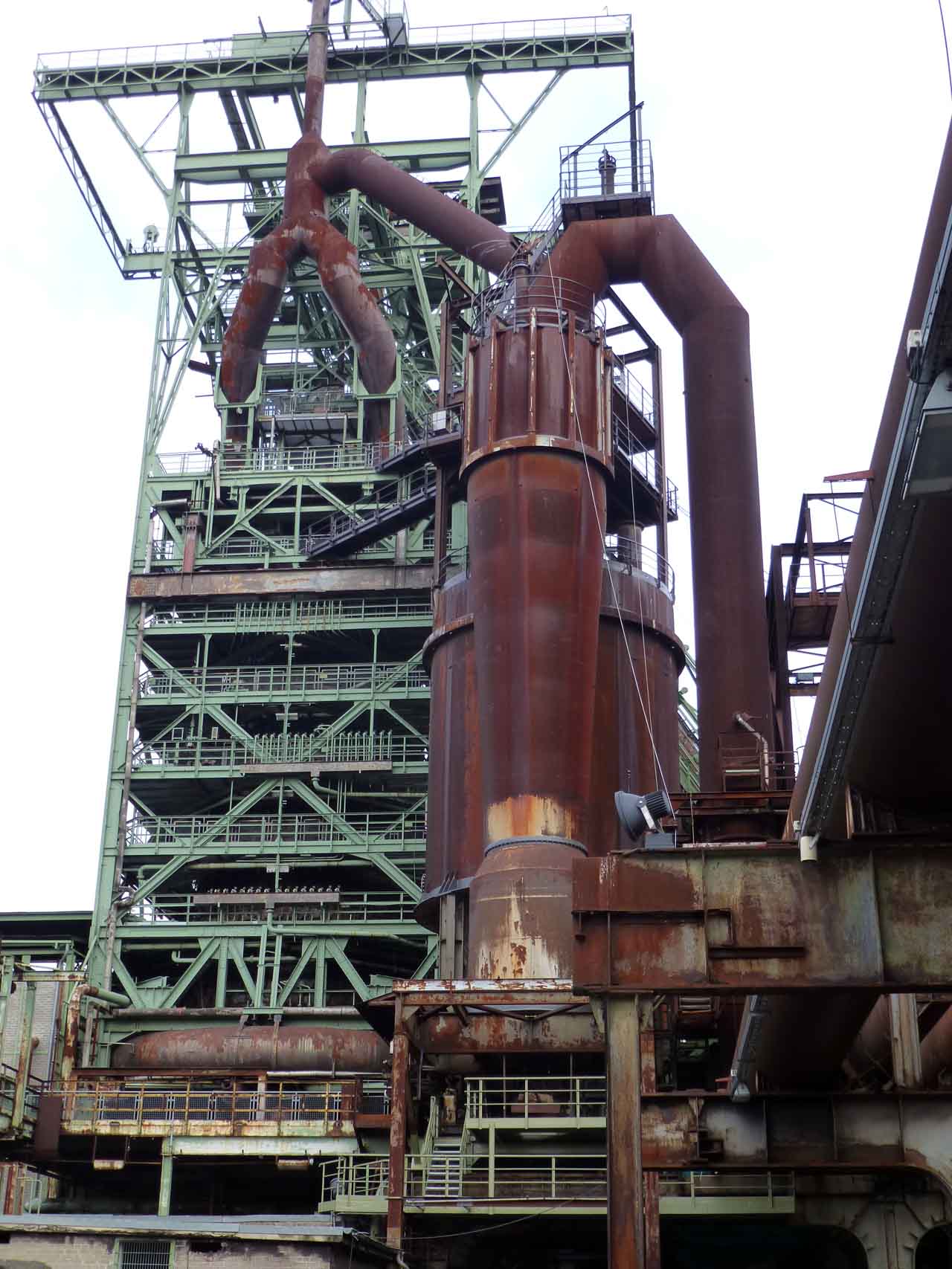 Steigen Sie langsam wieder runter vom schwindelerregenden Ofenkopf – gehen Sie ruhig mal ganz rauf, da ist Kirmes – an den Zuführungseinrichtungen des von den Winderhitzern vorgewärmten Gebläsewindes im mittleren Teil des Hochofens vorbei zum Ofengrund.