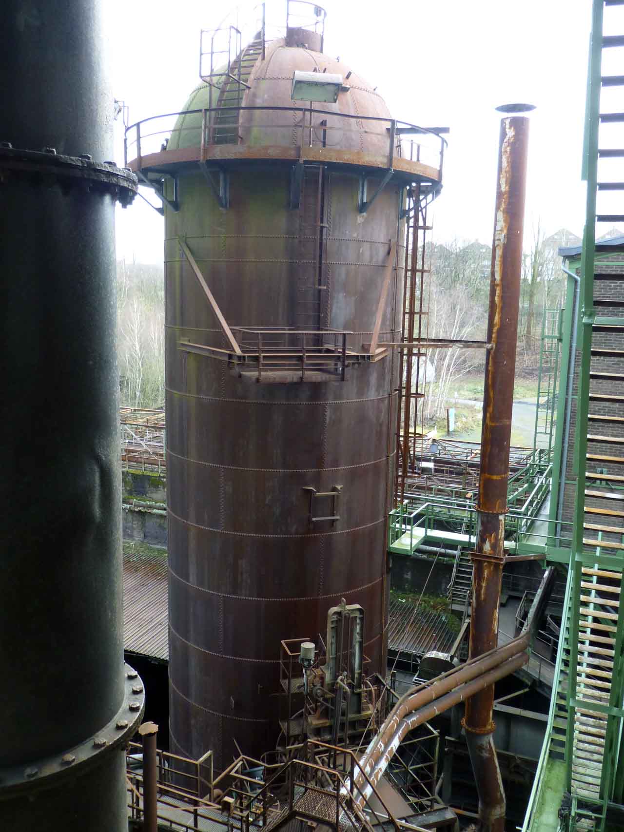 Gehen Sie entlang der Bunker zur Lagerung der Einsatzstoffe (Möller: Eisenerz und Zuschlagstoffe) und der Heizstoffe (Koks) und sehen Sie runter auf den Boden, wo der Möller runter musste, um festsitzendes Material zu lösen und viele dabei ihr Leben ließen. Und das ist nur ein Besuch in der Vorhölle, da unten im Möller. Wenn alles lief, kam das Material auf die angeschlossenen Transport- und Leitungssysteme, mit denen sie am Ofenkopf in den Hochofen eingebracht wurden.