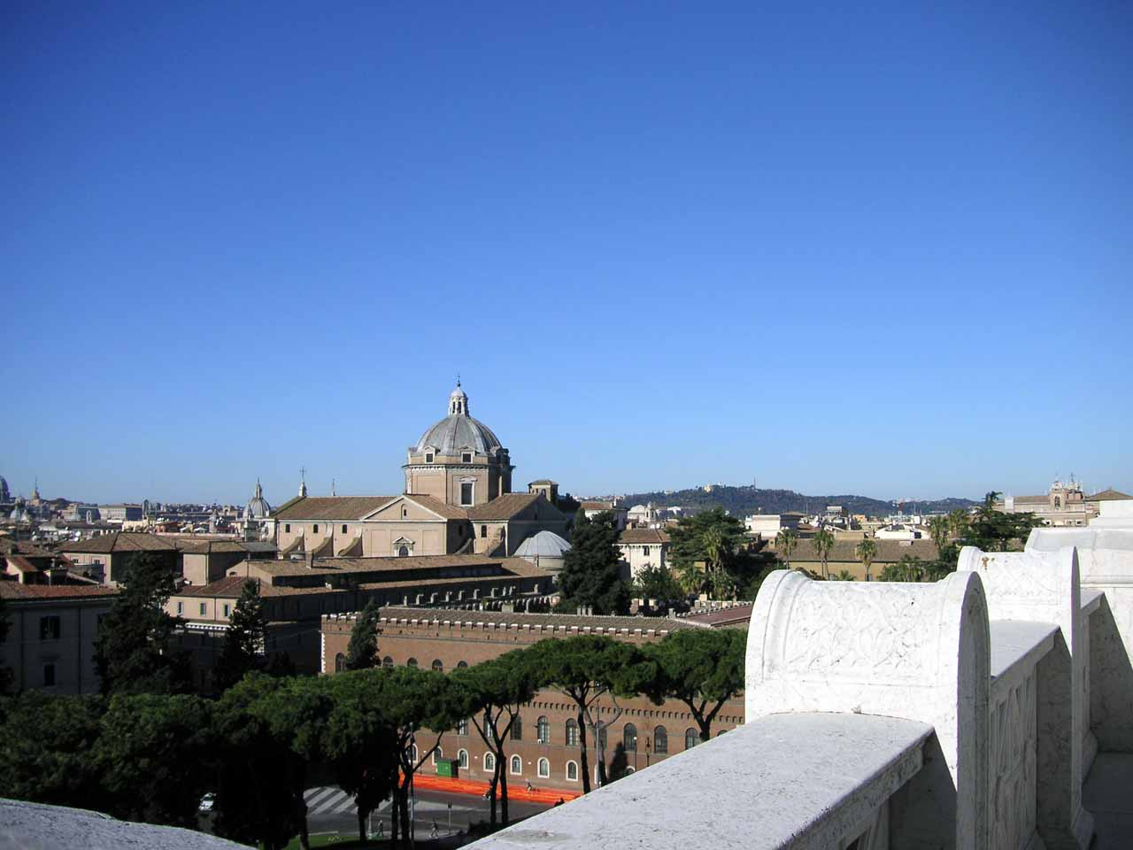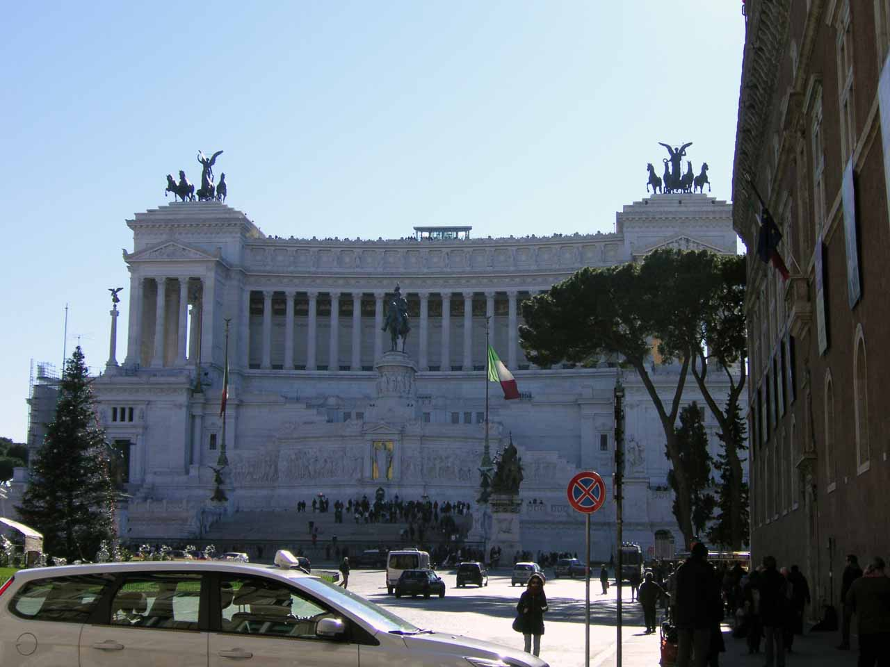 Schräg gegenüber steht das Vittorio Emanuele II, kurz das Vittoriano, ein wahrhaft gigantisches Nationaldenkmal der Italienischen Republik, von den Römern nur scherzhaft bis despektierlich als „Schreibmaschine“ bezeichnet. Hier befindet sich das Grabmal des unbekannten Soldaten und der Altar des Vaterlandes mit ewigem Feuer und Soldatenbewachung. Der Blick von der obersten Terasse aus geht über die Piazza Venezia in einer fast 270 Grad Rundumsicht über Roms große und bekannte Bauwerke. Dafür allein lohnt sich der Aufstieg. Auf der Rückseite auf der Terasse des kleinen Bistros sieht man hinunter ins Forum Romanum und hinüber zum Collosseum, was nicht minder spektakulär ist. Das Beste aber, ist man mal oben – es gibt auch einen Aufzug nach ganz oben – ist die Kirche Santa Maria in Aracoeli, deren Eingang man unweit des Aufzugs dorf findet.