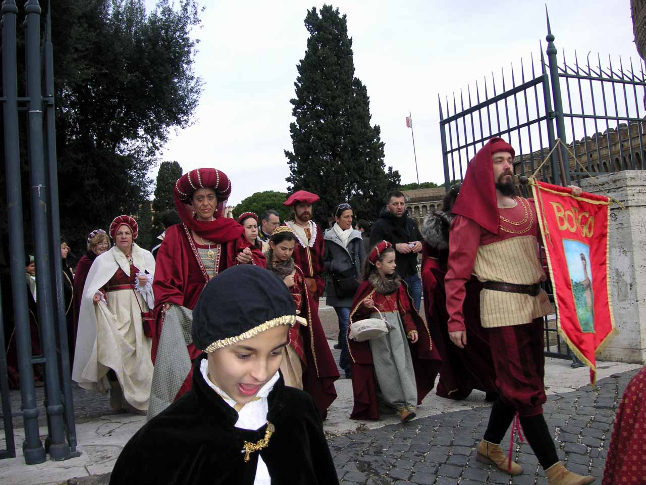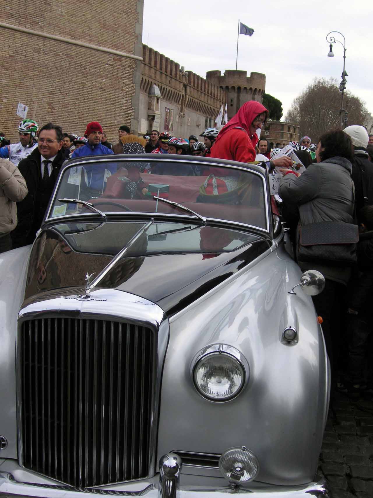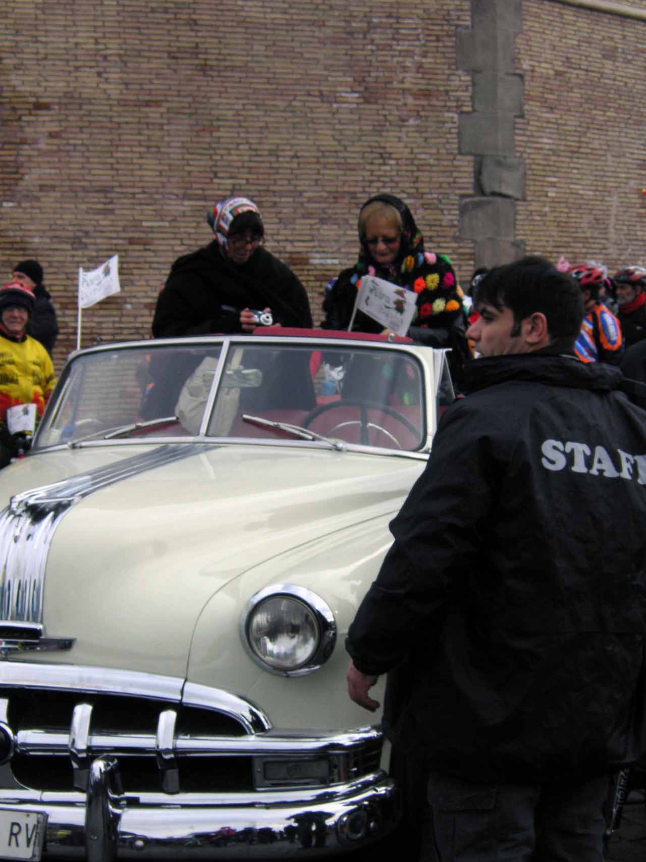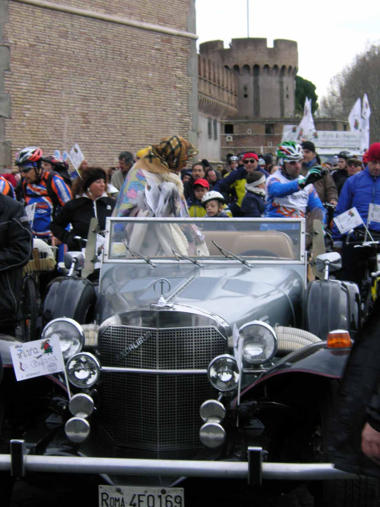 Der Name La Befana stammt vom Fest Epiphanias, dem Fest der Erscheinung des Herren (Die Heiligen drei Könige: Balthasar, Melchior und Kaspar). Gefeiert wird das Fest in seiner ursprünglichen Art in Italien traditionell mit großen Straßenumzügen, die aber nicht mehr in allen Gegenden verbreitet sind. Die Menschen verkleiden sich in Lumpen, die Befana wird traditionell von einer kleinen Gruppen Musikanten begleitet. Sie ziehen durch die Straßen und rufen die Kinder aus den Häusern, die ein Liedchen vortragen, wozu die Befana tanzt. Wie unschwer in den Bildern oben zu erkennen ist, hat sich in Rom an der Tradition ein klein wenig verändert, wobei, wenn man die Entwicklung von den Bescheidenheit symbolisierenden Lumpen zu den exklusivsten Motorkutschen an der Engelsburg und den auf modernste, riesige Digital-Monitore übertragenen Prunksitzungen des Heiligen Vaters mit einander vergleicht, wird man unschwer den erkennen, wer den Prozeß der Transformation von der demütigen Bescheidenheit in moderne Event-Unterhaltung zur Zeit als „leader of the pack“ anführt.