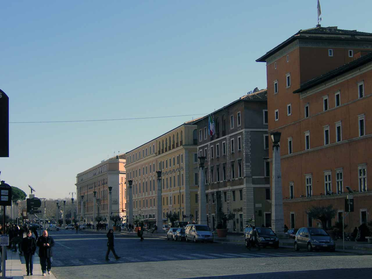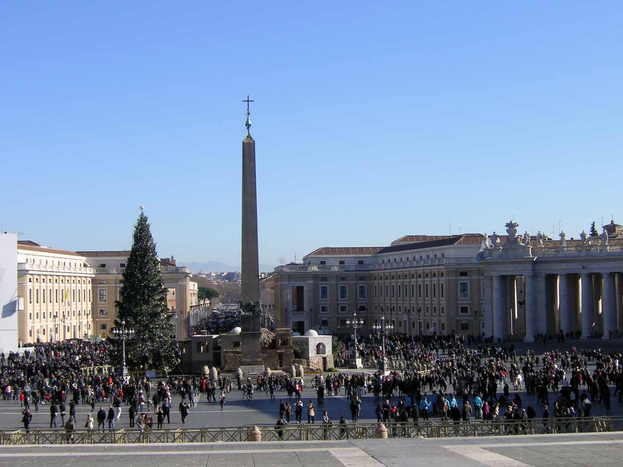 Vatikanischer Obelisk, Petersplatz, RomNicht nur der Obelisk ist eine Amputation des antiken Stadtkörpers. Der Bau des Platzes und des Doms wurden in nicht unerheblichen Ausmaß mit Steinen aus dem Forum Romanum vollendet; keine Glanzleistung an Integration. Die Wege der Baugeschichte von Platz und Dom sind lang. Von der Zeit der Konstantinischen Basilika (Alt St. Peter) reicht die Geschichte bis heute, wo man die 367 Säulen und 140 Statuen gerade renoviert. Die meiste Zeit bis Berninis Neugestaltung Mitte des 17. Jhds. war der Platz eine riesige Baustelle und ein unansehliches Sammelsurium von unterschiedlichsten Stilen vergangener Epochen, architektonischen und liturgischen Auffassungen.