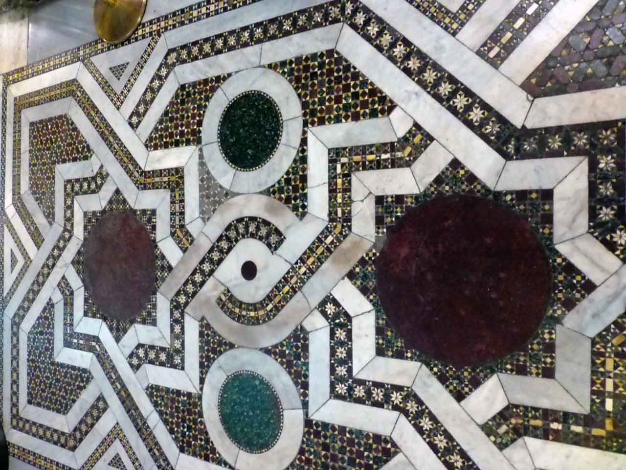 Während der Boden mit herrlichem Marmor und Porphyr, also vulkanischem Gestein, ausgelegt ist, zeigt die Decke erstaunliche arabische Schnitzkunst in Art von Muquarnas, wie wir sie auch in einigen Kirchen in Palermo finden und hier auf der Seite schon vorgestellt haben.