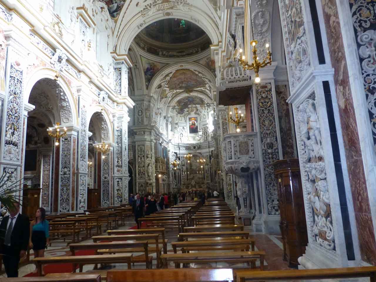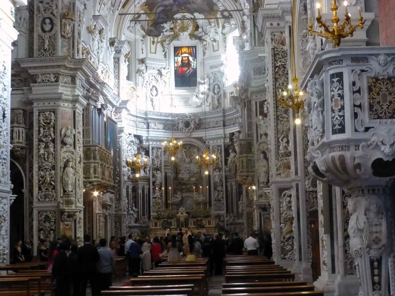Von reformativem Gedankengut ist allerding innen in der Gesù wenig zu erkennen. Hier überwiegt ausschweifender Barockstil aus vielfarbigem, fein gearbeiteten Marmor, üppige Stuckaturen und großdimensionierte Fresken. Insbesondere die marmornen Reliefs mit ihren figürlichen und ornamentalen Motiven an den Pfeilern und die perspektivisch angelegten Marmormosaike sind einzigartig und in einer Fülle vorhanden, die selbst in der sizilianischen Variante des Barocks selten zu finden ist.