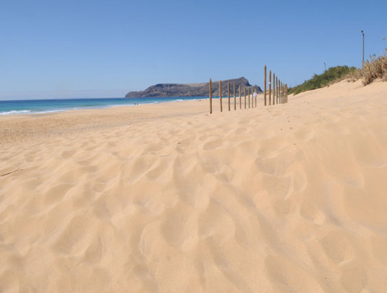 Porto Santos Strand liegt eingebettet in einer Landschaft aus sanften Hügeln, wilden Gräsern und Heidekrautgewächsen. Immer wieder stechen bizarre Felsformationen hervor, die Wind und Wasser in die Bergrücken gezeichnet haben. Hier im Hinterland liegt der 18-Loch-Platz des berühmten Golfweltmeisters Severiano Ballesteros. Er hat ihn eigens für die natürlichen Gegebenheiten der Insel konzipiert. Auf der Nordseite führt das Spiel an der Steilküste vorbei, im Süden an Seen und an einem Kurzplatz. Anfänger trainieren auf der Driving Range, Fortgeschrittene werden mit Traumaussichten über den Atlantik belohnt.