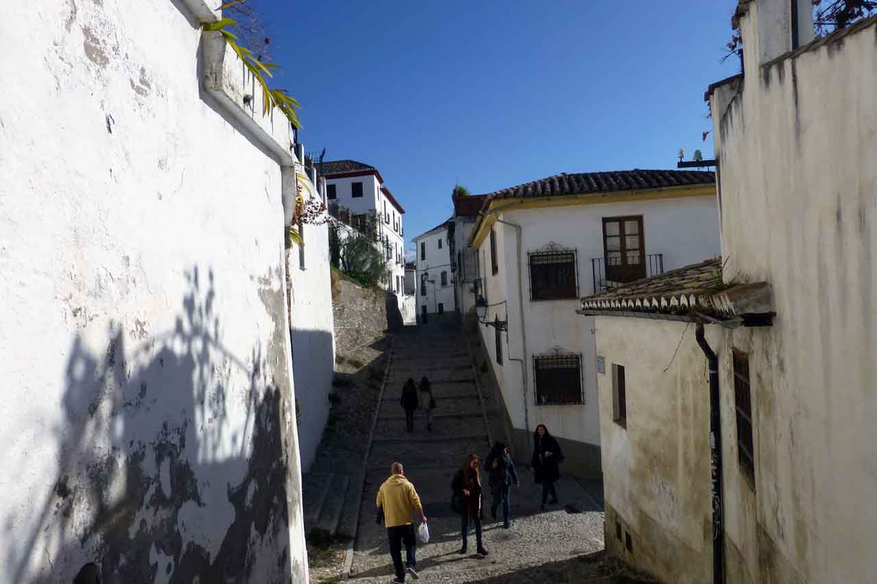 Der Albayzín (manchmal auch Albaicín geschrieben) ist das alte maurische Viertel von Granada. Er liegt auf dem gegenüberliegenden Hügel der Alhambra. Wer den Albayzin nicht gesehen hat, hat Granada nicht gesehen. Er ist wie ein Dorf in der Stadt. Von der Plaza Nueva kann man mit dem Bus (Linie C1) oder dem Hop-on/Hop-off Bus (Granada City Tour) hinauf zum oberen Albayzín fahren.