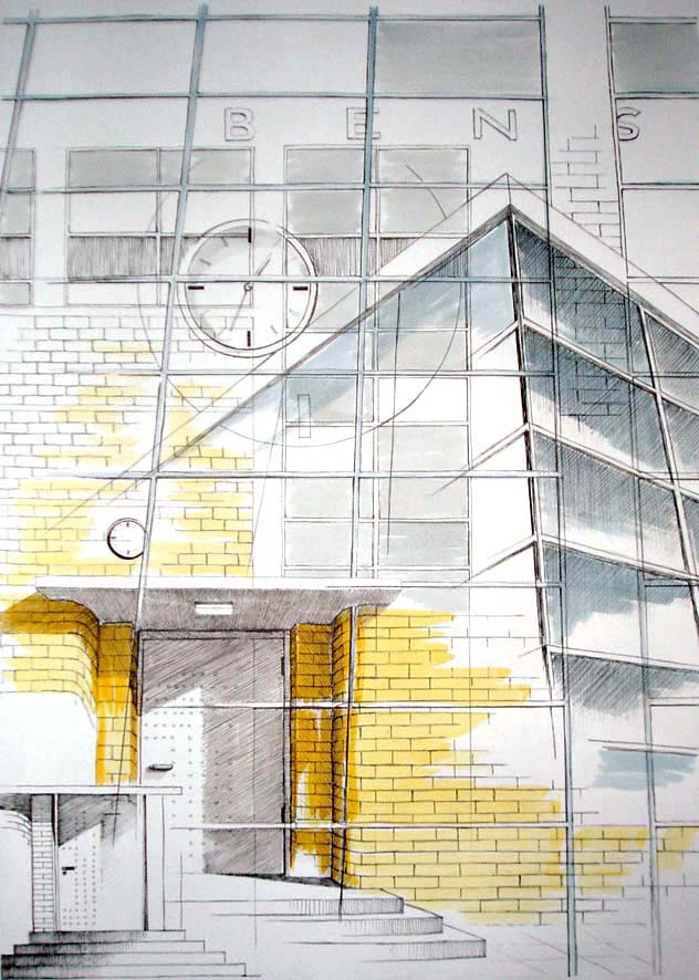 Die Bauhaus-Architektur bildete ursprünglich nicht das Schwerpunktthema des Künstlers Torsten Paul aus Hannover. Waagerechte und Senkrechte verlaufen strikt zum Quadrat oder Rechteck und bilden so die geometrische Grundform dieser Gebäude.