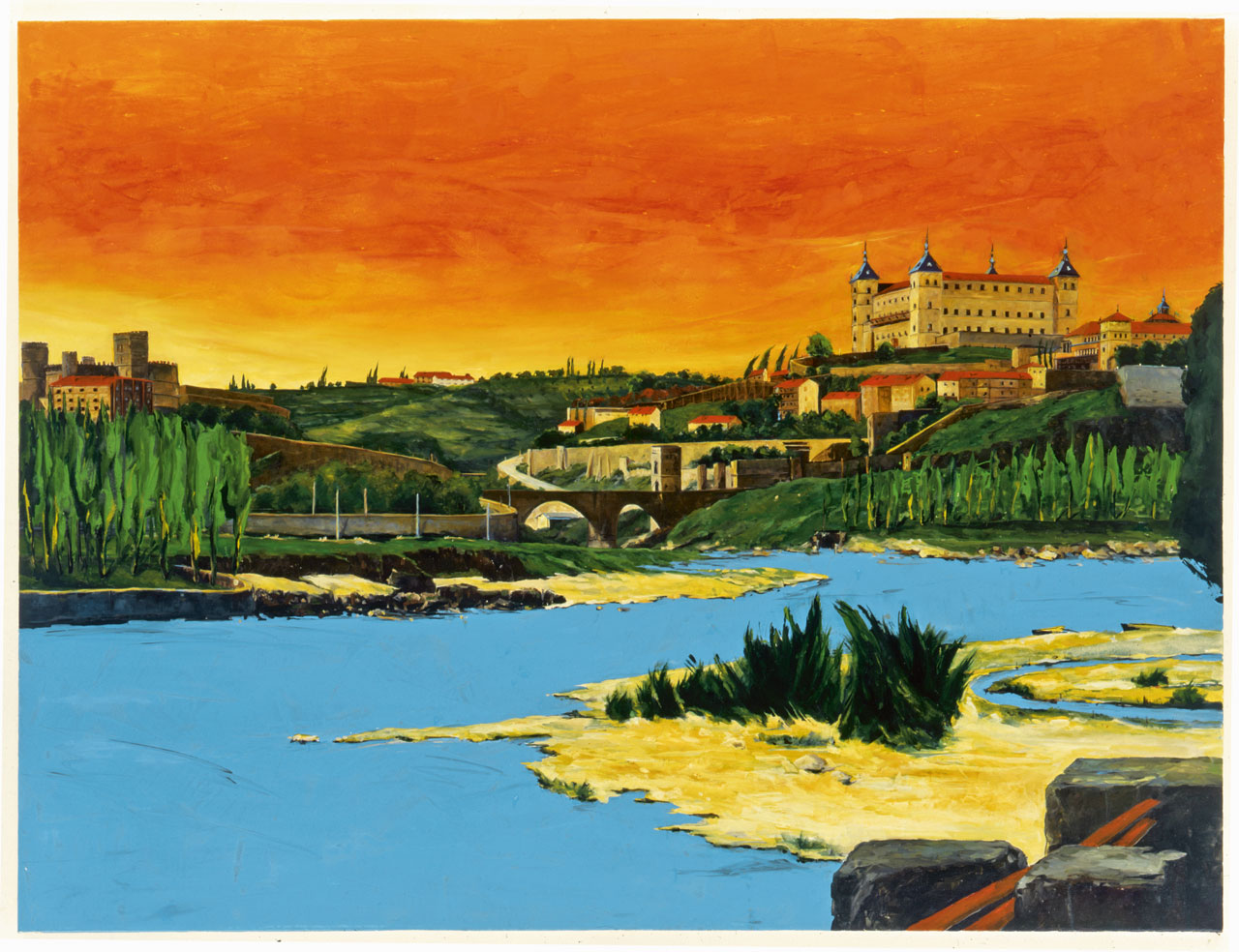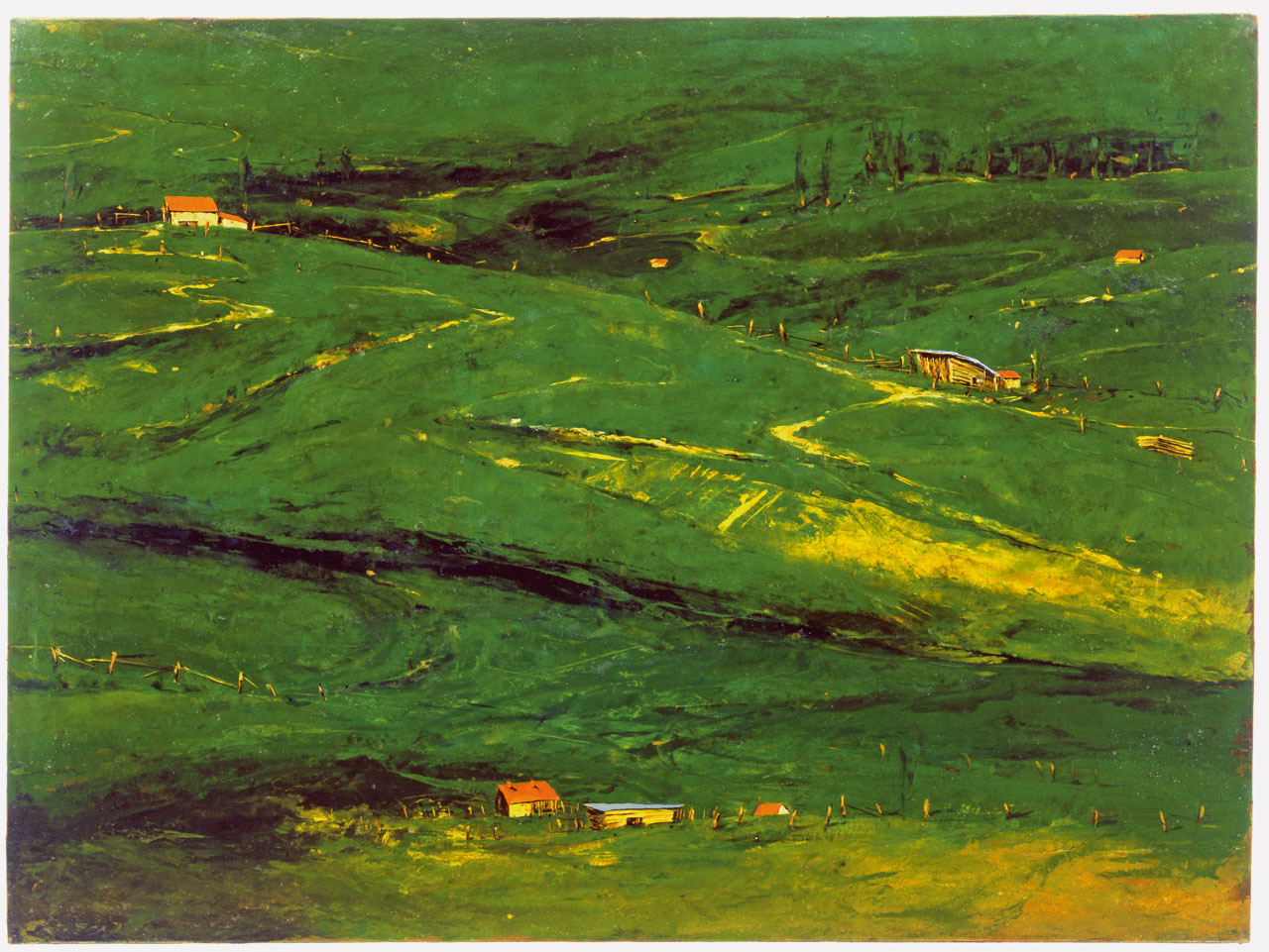 Indem er z. B. satte, grüne Bergwiesen suggeriert, die in unseren Köpfen entstehen, obwohl sie fast unkenntlich amorphe Farbflächen sind, geschüttet und grob mit Spachtel bearbeitetet, oder Burgen, deren typisiertes Aussehen wir glauben wiederzuerkennen, obwohl die typischsten Ansichten sich der Darstellung von Rückseitenansichten verdanken; honi soit qui mal y pense.
