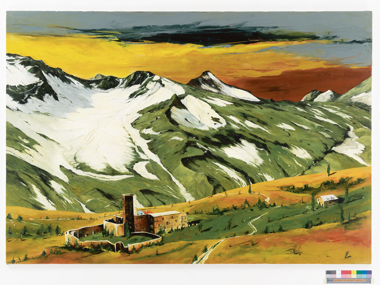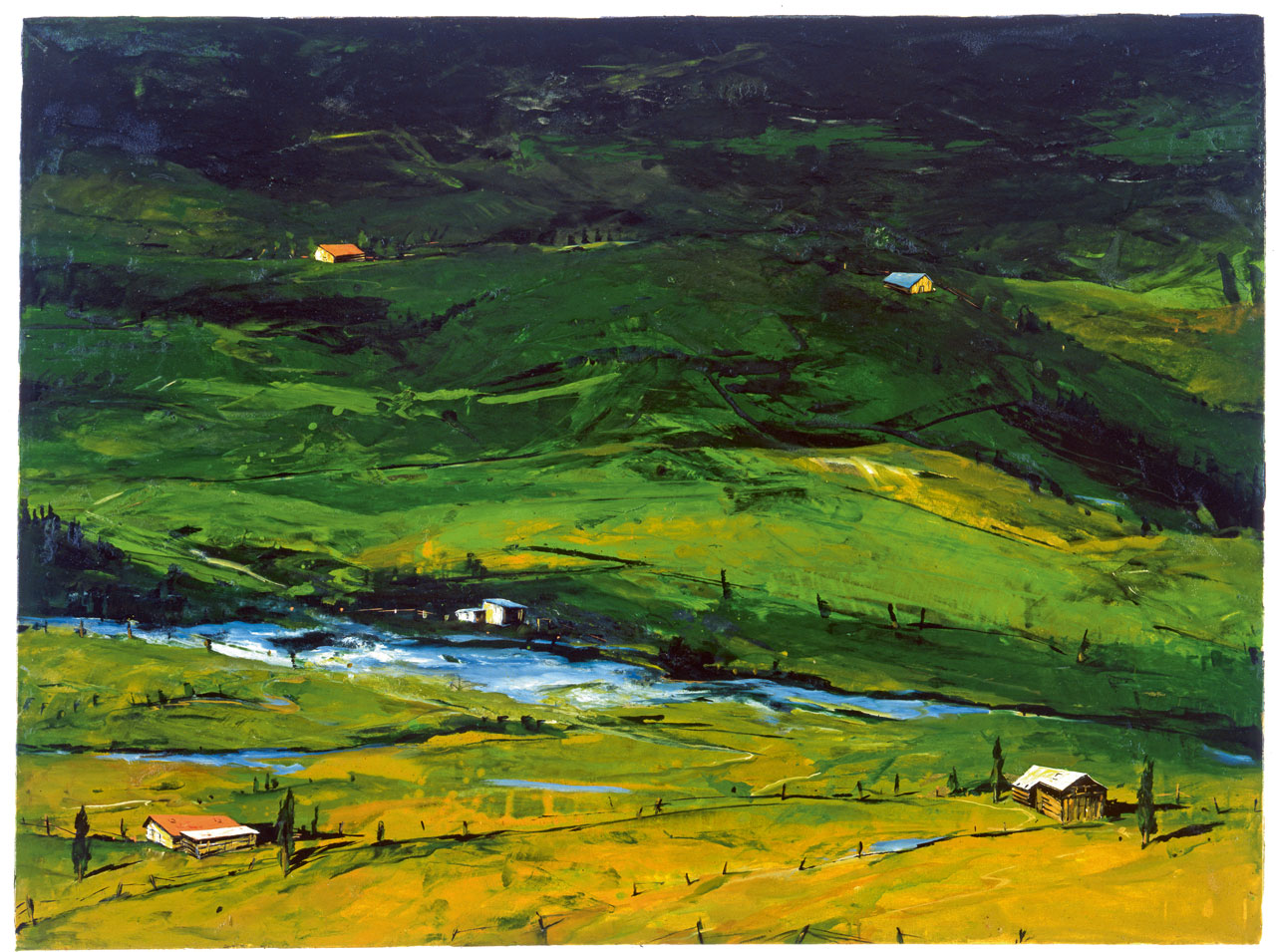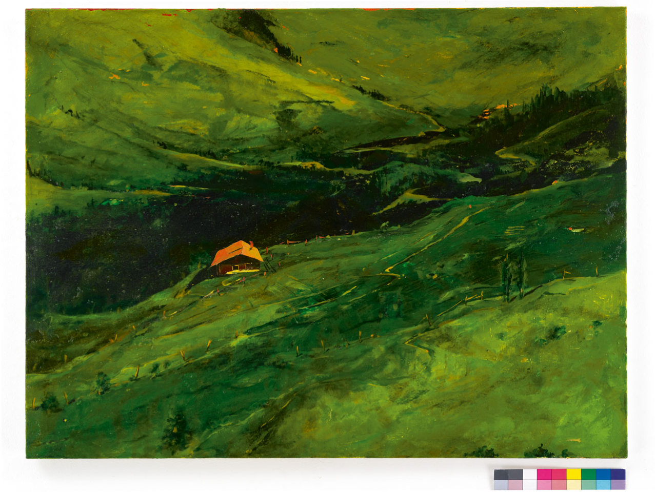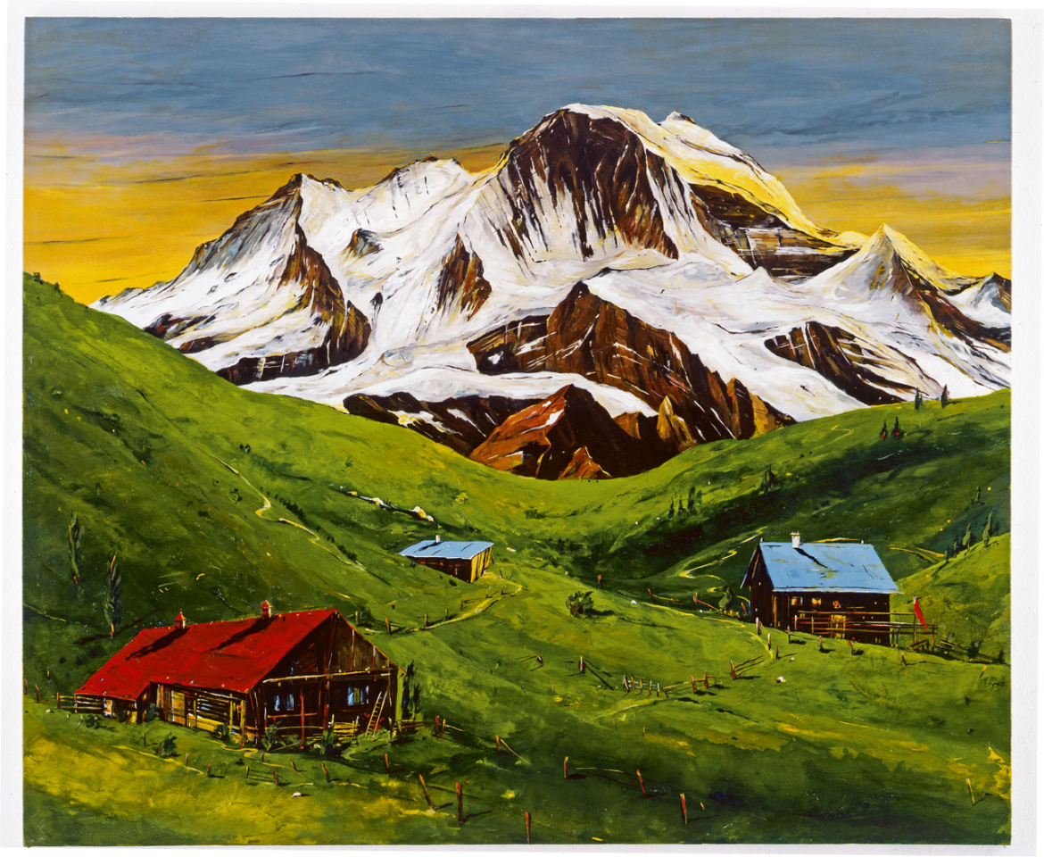 So malt er in seine Landschaften auch nonchalant geradezu stilbrüchige Hütten mit roten Dächern, gelegentlich Wege und azurblaue Bachläufe, die nie dagewesen sind und in ihrer Detailtreue dem Malstil des Bildes konträr entgegenstehen, einfach aus künstlerischer Freiheit und wegen der Balance des Bildes. Und, sicherlich auch mit einem gewissen Schmunzeln, um die idealtypischen Assoziationen im Betrachter anzuregen, gleichzeitig auch ein wenig zu karikieren.