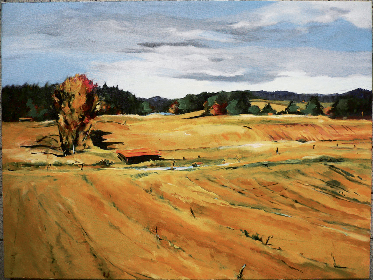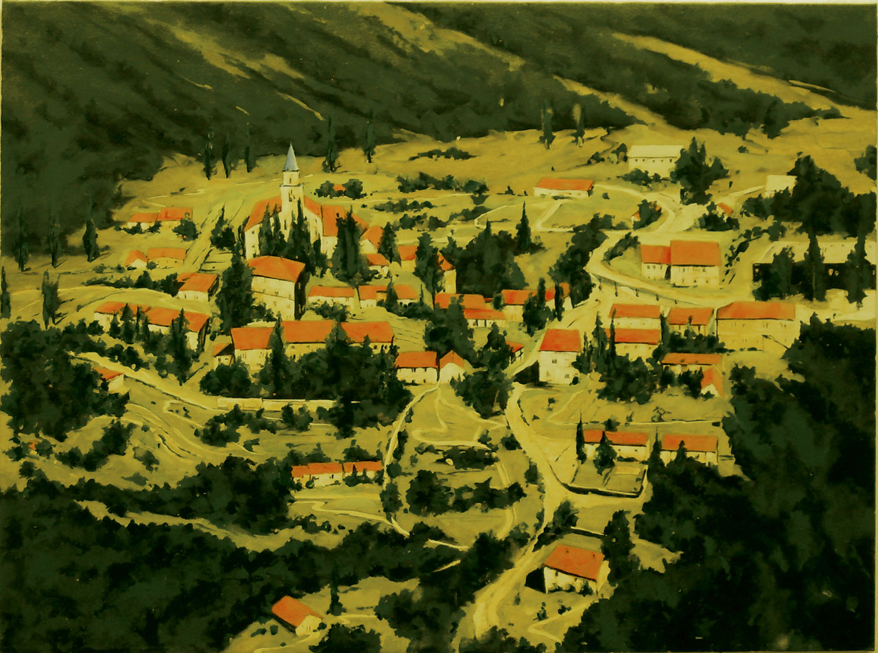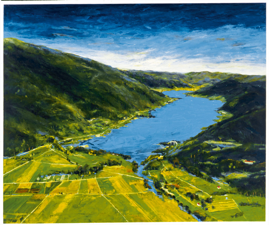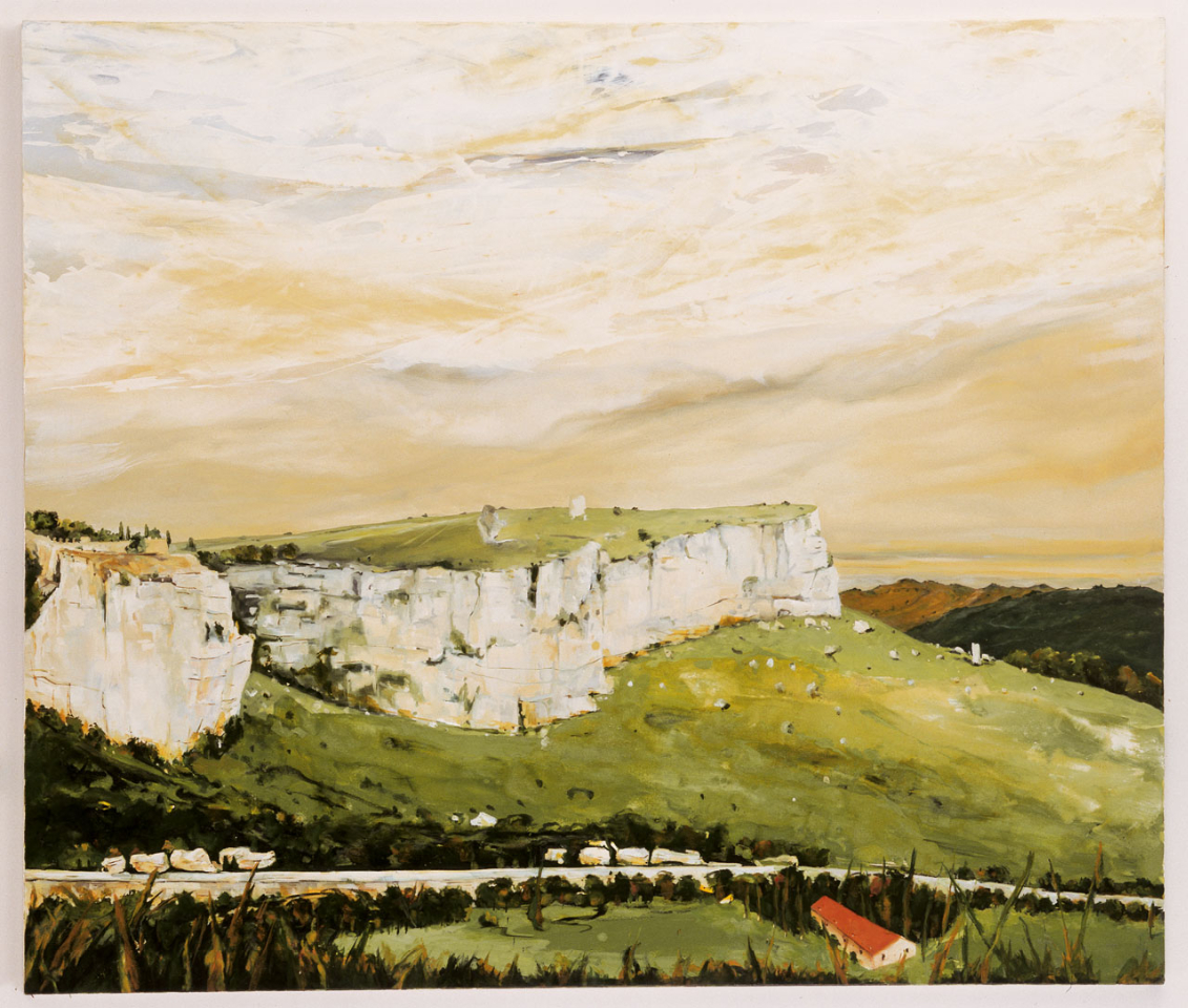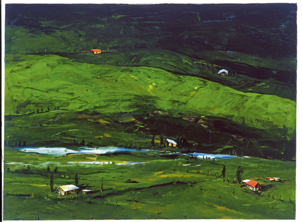 So malt er in seine Landschaften auch nonchalant geradezu stilbrüchige Hütten mit roten Dächern, gelegentlich Wege und azurblaue Bachläufe, die nie dagewesen sind und in ihrer Detailtreue dem Malstil des Bildes konträr entgegenstehen, einfach aus künstlerischer Freiheit und wegen der Balance des Bildes. Und, sicherlich auch mit einem gewissen Schmunzeln, um die idealtypischen Assoziationen im Betrachter anzuregen, gleichzeitig auch ein wenig zu karikieren.