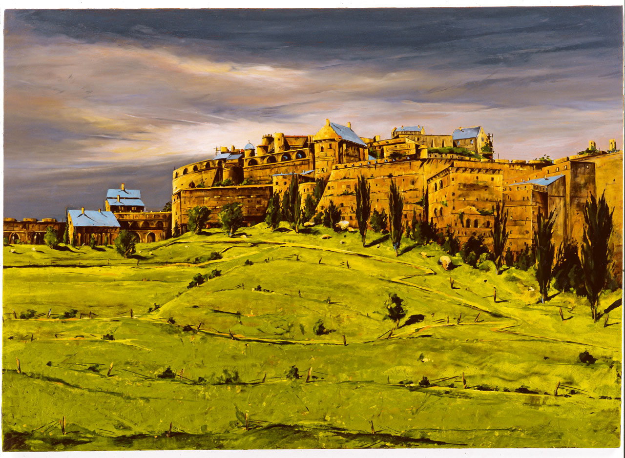 Mit idealtypischem Malen hat Holubitschka also eher nichts zu tun, er zeigt Rückseiten. Die Wiese hinter der Burg ist auch in Wirklichkeit nicht vorhanden, vielmehr noch ist sie in ihrer Malweise geradezu kontrastiert zum Gebäude. Findet man im Motiv der Burg noch hinreichend detailgetreue Darstellung der Rückseiten, ist bei der Wiese bzw. Landschaft hinter der Burg eher grobes Werkzeug eingesetzt. Erinnert an Cézanne wirken große Bildelemente bei Holubitschka wie moderne Abstraktionen, weniger figurativ. Da wird Farbe geschichtet, gespachtelt, hin- und herkorrigiert, verwischt, mit Pappe oder Holz gedrückt, wieder gewischt und geritzt, bis so etwas wie Struktur oder etwas, das in seiner Farbigkeit und Struktur so aussieht, wie eine Wiese, eine Landschaft entstanden ist.