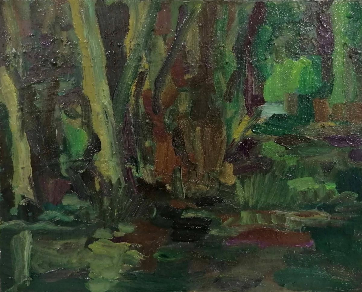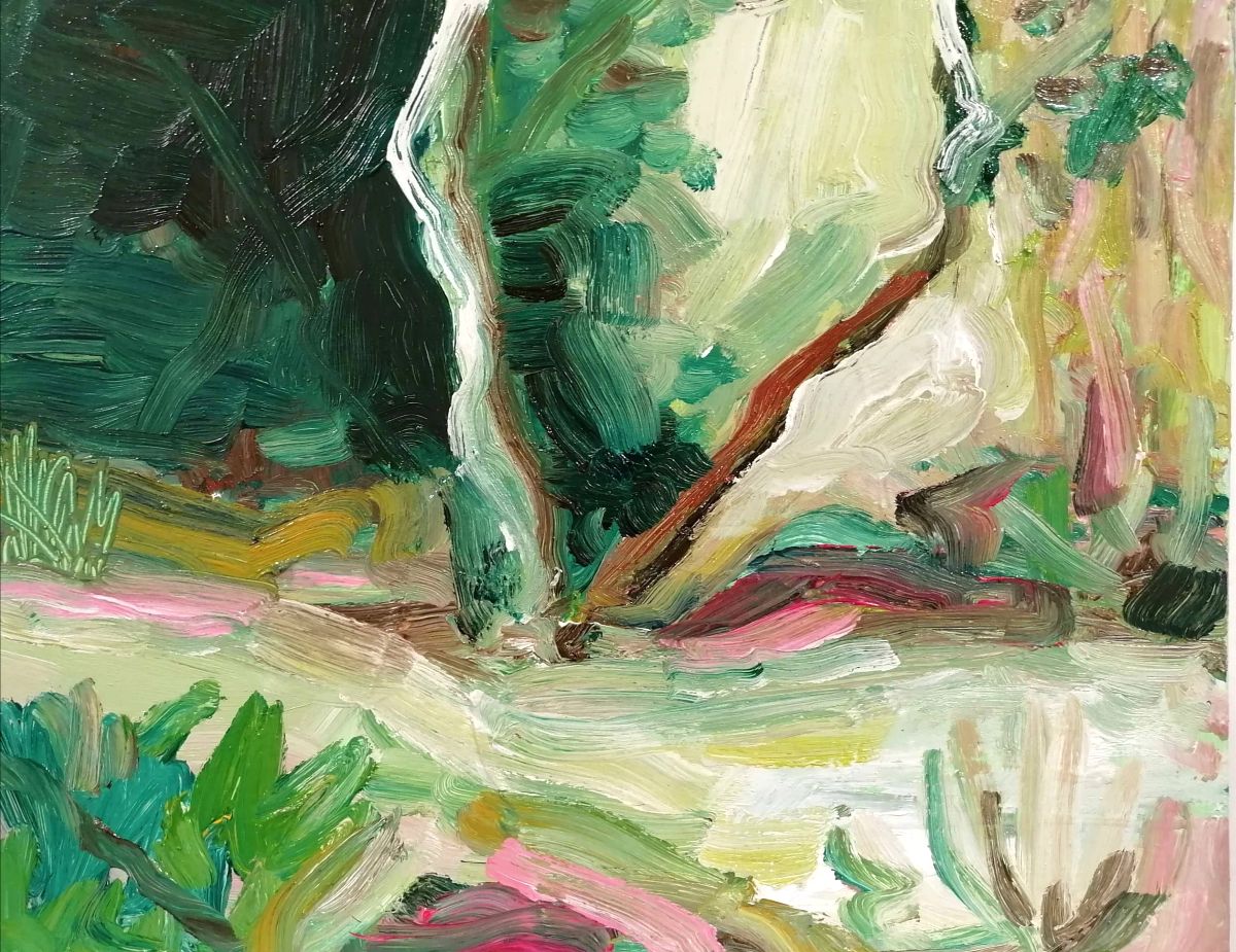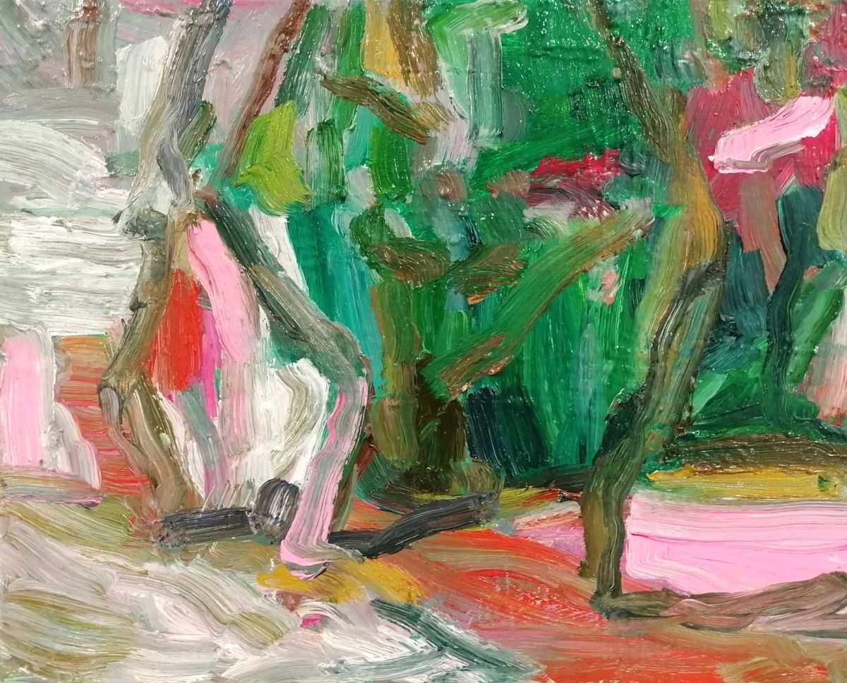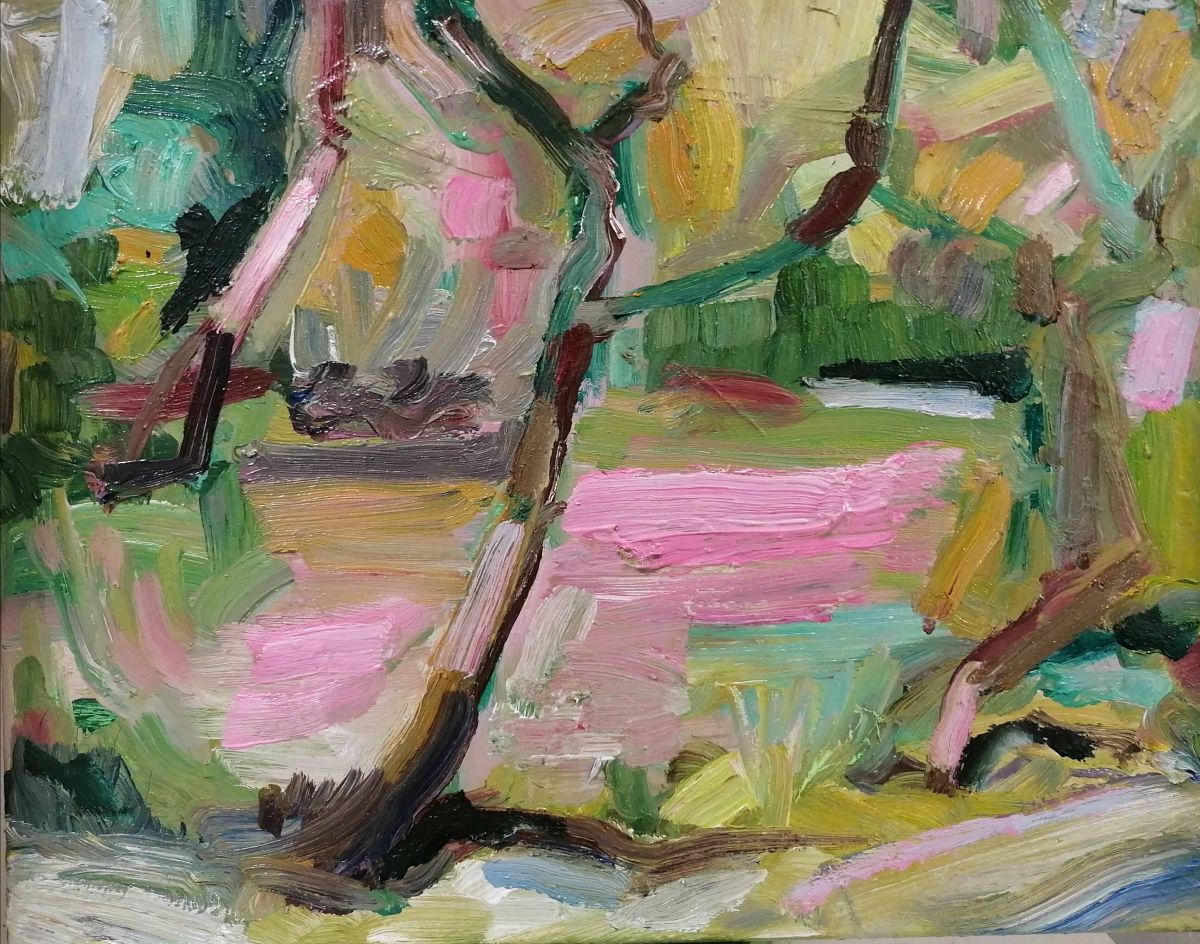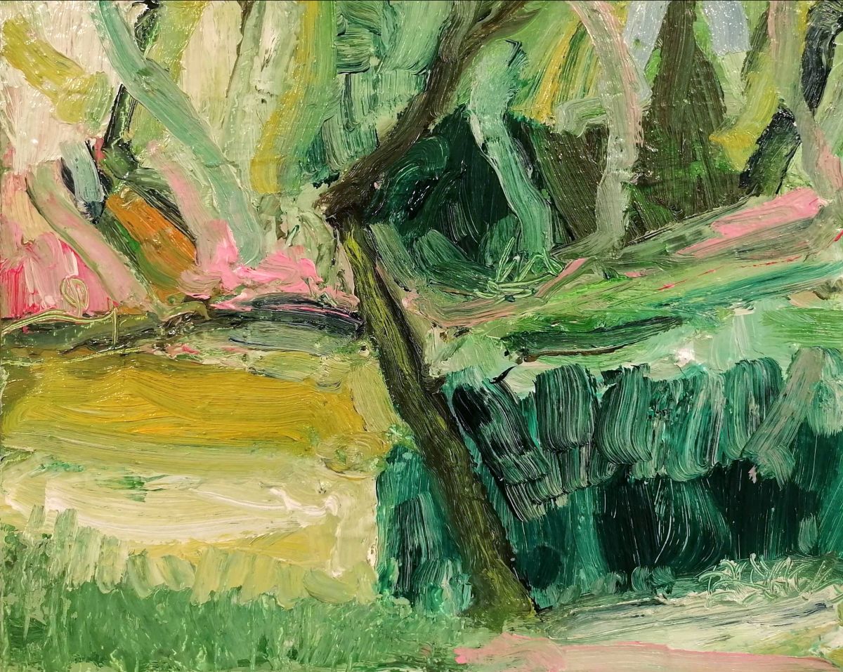 Diese Themen verweben sich in der Bild-Konstruktion hauptsächlich in waagerechte und senkrechte Naturelemente. Diagonale oder Winkel geben der Komposition dramatische Tiefe. Pflanzen können natürlich oder aus der Malerei heraus entstehen und künstlich sein. Das Bild selber bestimmt die Farbharmonie.