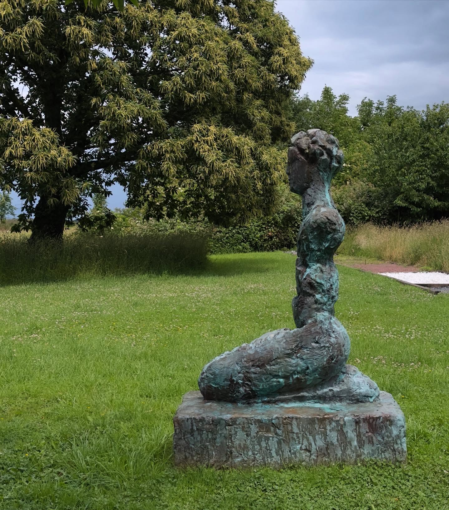 Wir sehen eine Figur, eine Gestalt, die wir leicht mit einer Frauengestalt assoziieren können, und die in einer bestimmten Haltung eine sitzenden, auf ihren Unterschenkeln sitzende Figur vorstellt.