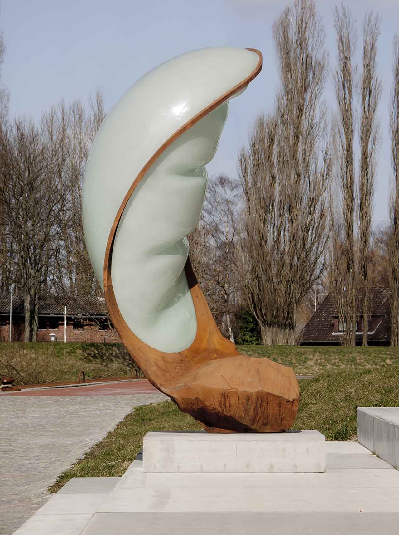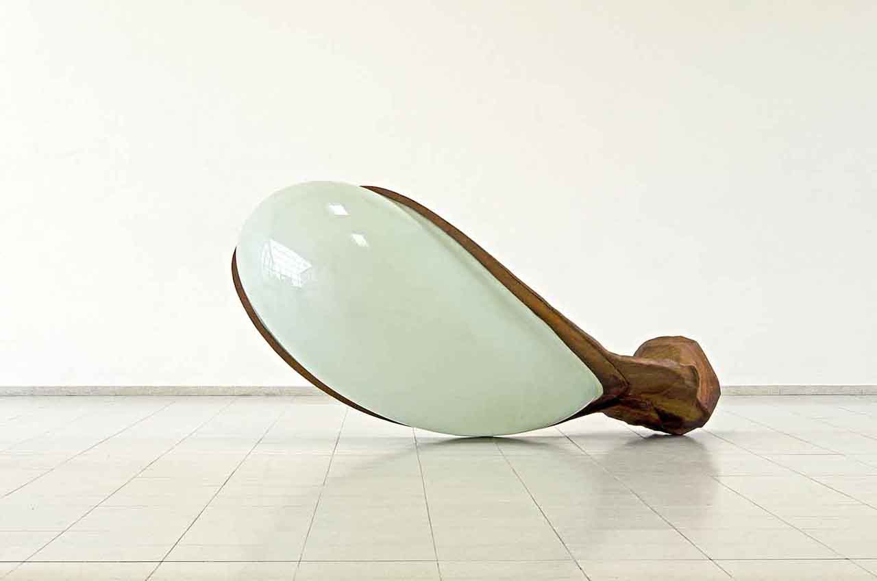 Erhitzen und Abkühlen, oft in langwierigen, abwechselnden Prozessen braucht seine Kunst, wie neuerdings auch den Luftdruck, der im Wechsel mit Freiformpressen plastisches Material zu leicht anmutenden, schier transparenten Formen aufbläst, die dann wiederum mit schweren Sockeln zum Werk verbunden werden.