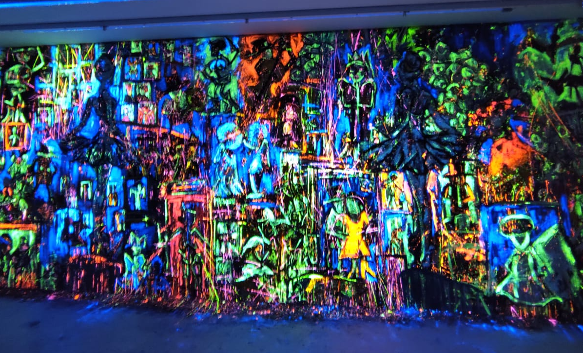 Während das Gemälde bei völliger Dunkelheit noch einfarbig und zeichenhaft wirkt, ersteht nun vor dunklem Grund ein ungeahnter Tiefenraum. Durch die extreme Leuchtkraft der Farben treten einzelne Bereiche in den Vordergrund und gewinnen zugleich an Plastizität, während andere Figuren, die zuvor bei Tageslicht eine starke Farbigkeit aufwiesen, in den Hintergrund treten und mit der schwarzen Bildfläche verschmelzen, die sich selbst in ihrer Materialität aufzuheben scheint. Gleichzeitig verliert das Bild seine Eingrenzung durch die Konturen der Leinwand und scheint eins zu werden mit dem Betrachterraum. (Text von der Webseite Meral Alma)
