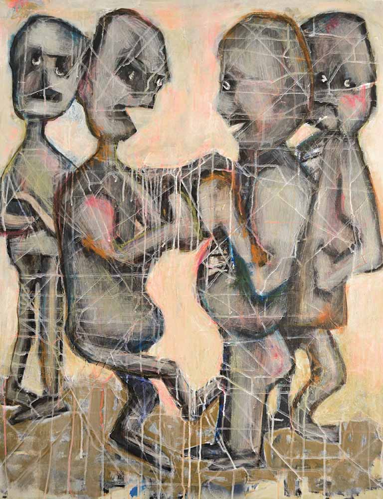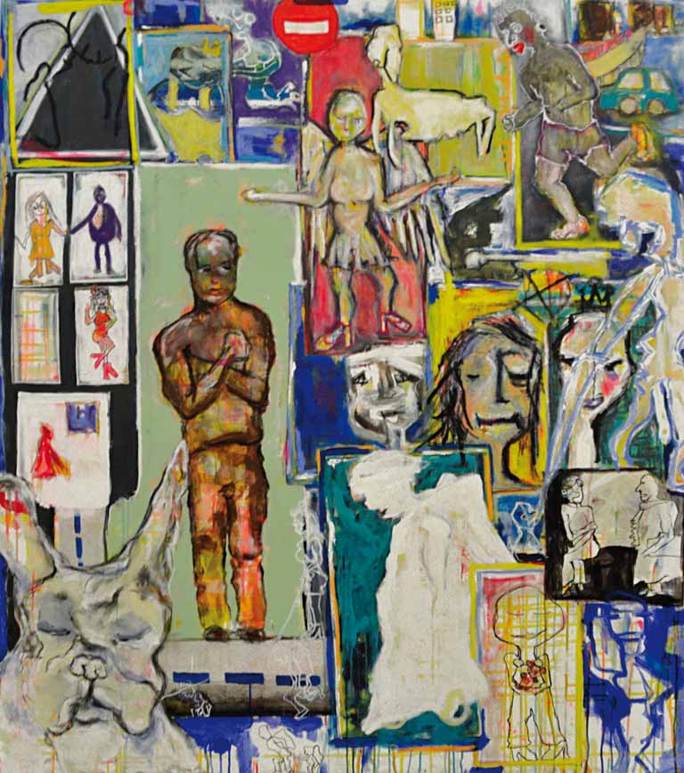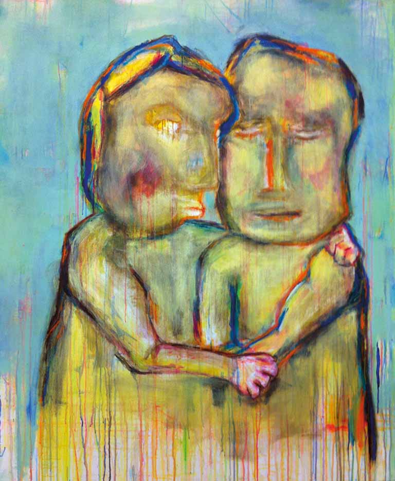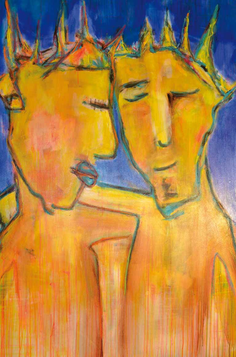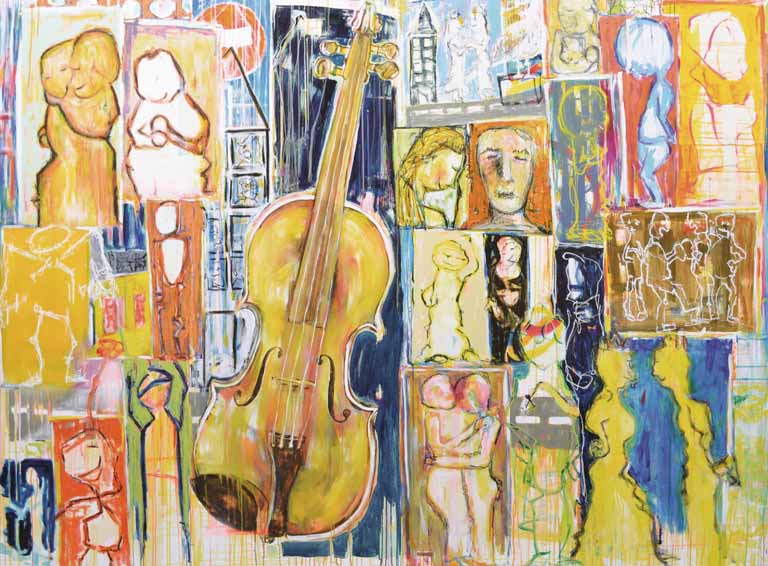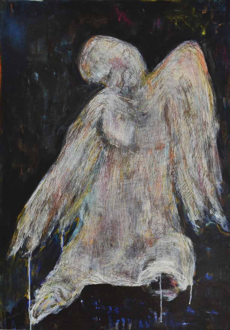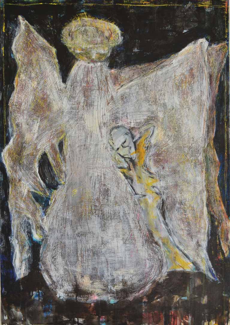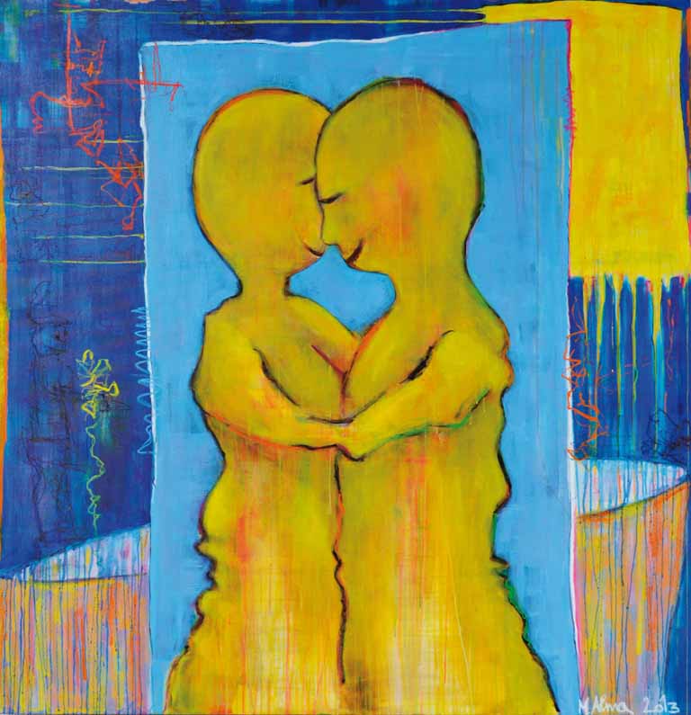 Beide auf den ersten Blick Körper, dem menschlichen, weiblichen Körper im Falle der Instrumente gewiss ähnlich. Bratsche, Engel und Gitarre tauchen auf in Almas Werken, in denen weibliche Körper, nackte Körper nicht selten eh schon eine Rolle spielen; also warum? Da die Musikinstrumente keine Saxophone sind, erübrigt sich auch der Rekurs auf Basquiat an dieser Stelle. Was das Motiv des Engels sicherlich zu einer interessanten Einmischung in die zwischenmenschlichen Beziehungen macht, ist vielleicht sein Wesen: Engel sind geschlechtslos, transsexuell. Engel, lateinisch angelus, gotisch aggilus von altgriechisch ἄγγελος ángelos, sind auch Boten, Geisteswesen, Abgesandte; im Christentum, Judentum und im Islam von Gott geschaffene Wesen, ihm untertan. Besonders im vorderasiatischen Kulturraum stark verbreitet ist auch die Vorstellung von Engeln als Mittler zwischen der Welt und Gott. Sie sind keine Vollgötter, sondern Halbwesen, gehören zwar in der altgriechischen Mythologie zur sakralen, göttlichen Sphäre aber nur als Halbgottheiten, denen aber gleichzeitig auch die Attribute weltlicher Wesen fehlen.