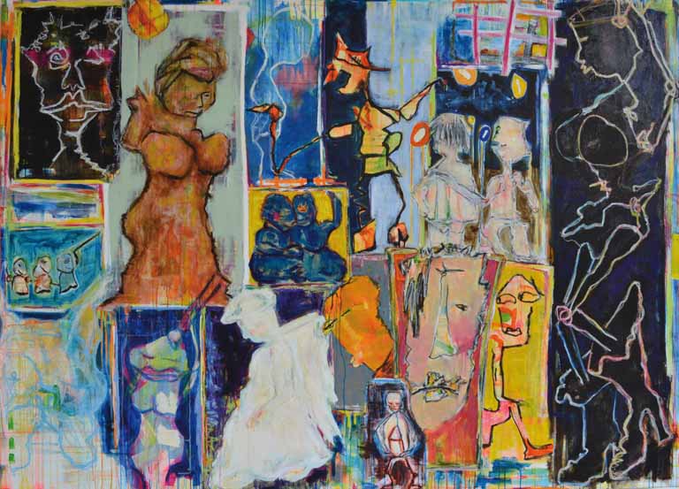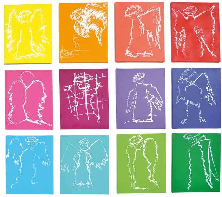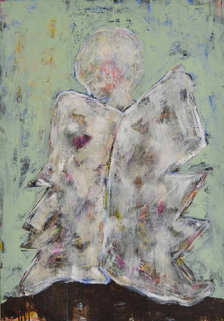 Die Vorstellung eines geistigen Wesens neben dem Hauptgott oder den Hauptgottheiten unserer Mythologien als Bote und Mittler mag für den ein oder anderen antiintellektuell sein, bei Meral Alma sind sie Metaphern der Transzendierung, manchmal der Transgression und Metamorphose. Sie widersetzen sich der Ordnung des Anderen, der Gesetze, Zwänge, festgefügten Vorstellungen und Verhaltensweisen, die in dem gitternetzartigen Bildaufbau und den zellenartigen Farbkompositionen aufscheinen. Sie sind Imaginationen, Metaphern einer möglichen Überschreitung, mithin Metaphern der Künste wie es die Musik für Alma bzw. für andere Menschen auch sein kann. Sie bezeichnen keinesfalls einen Ort des Anderssein, einer Authentik, einer Wahrheit, eines gelingendes Andersseins. Wo soll der sein? Wo wohnen Engel? Dort, wo alle wertsetzenden Unterschiede aufgehoben sind, dieser „Ort“ der Idee ist und bleibt der Reichtum eines freien Geistes; und den bewahrt Meral Alma.