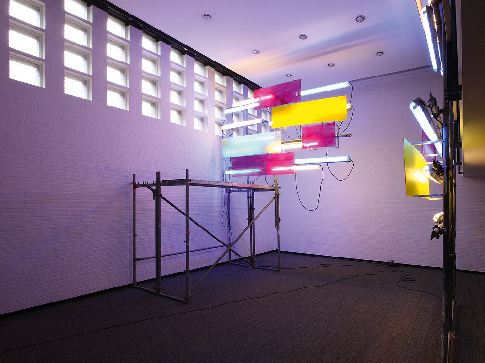 Die imponierende, leuchtende Schönheit von Schwers Billboards basiert auf der stark reduzierten Farbskala von Rot, Blau, Grün und Gelb und ist doch einzig sichtbar durch elektrischen Strom. Zieht man den Stecker, ist es aus mit der strahlenden Leuchtkraft des meist groß-dimensionalen Bildraums der Installation, erlischt sie zu nüchterner, illusionsloser, dinghaften Nichtigkeit, die nicht mal mehr ein rein visuelles Objekt vorstellt.