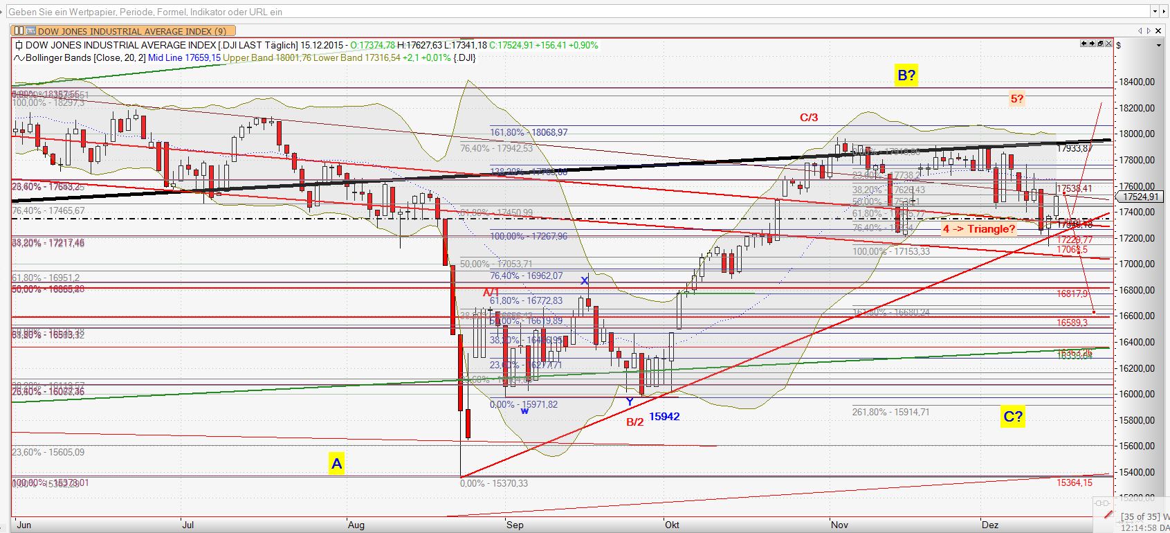 Seit der letzten Analyse vom 03.11.2015 hat der Dow Jones eine Trading Range zwischen 17.977 als vorläufigem Hoch der Erholungsbewegung seit August und 17.187 vom 14.12.2015 als unterer Begrenzung ausgebildet.