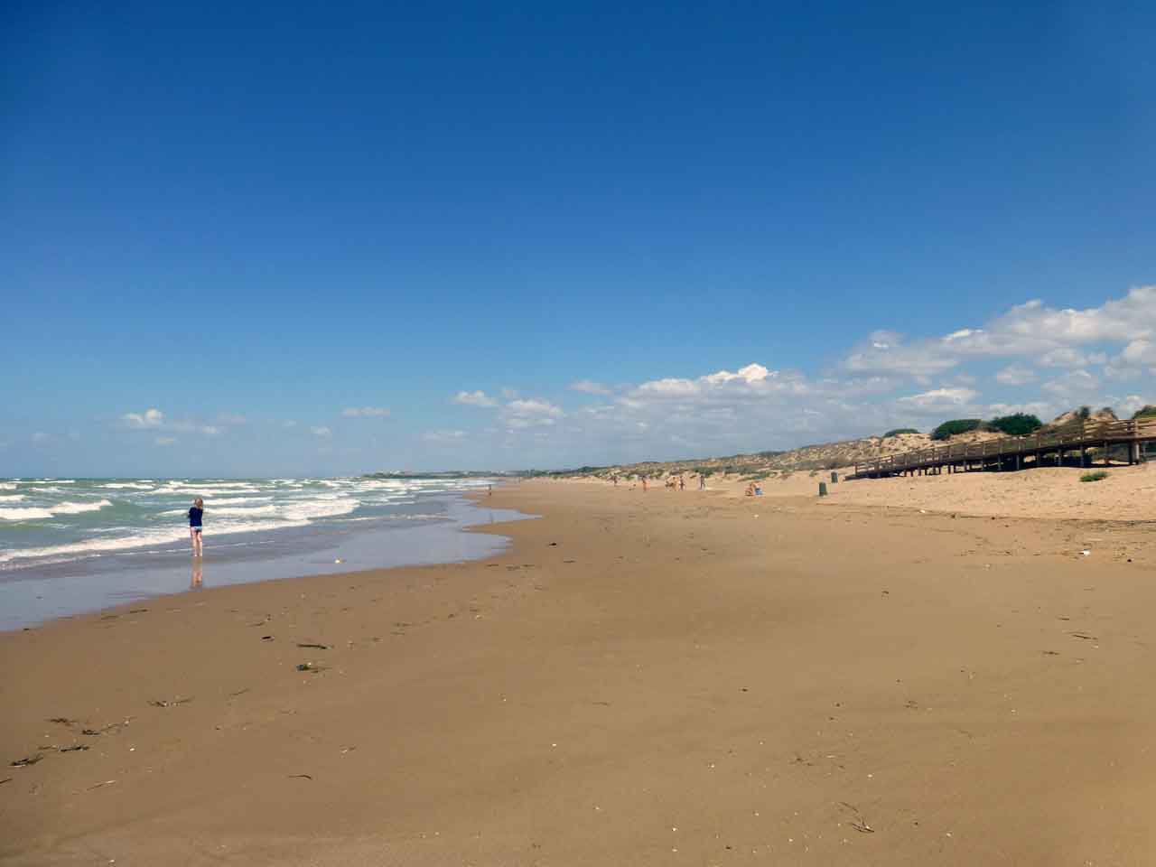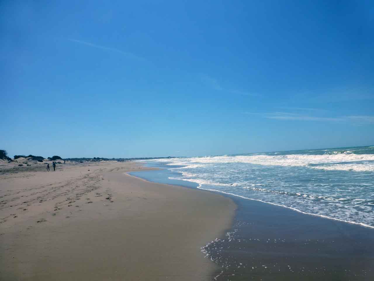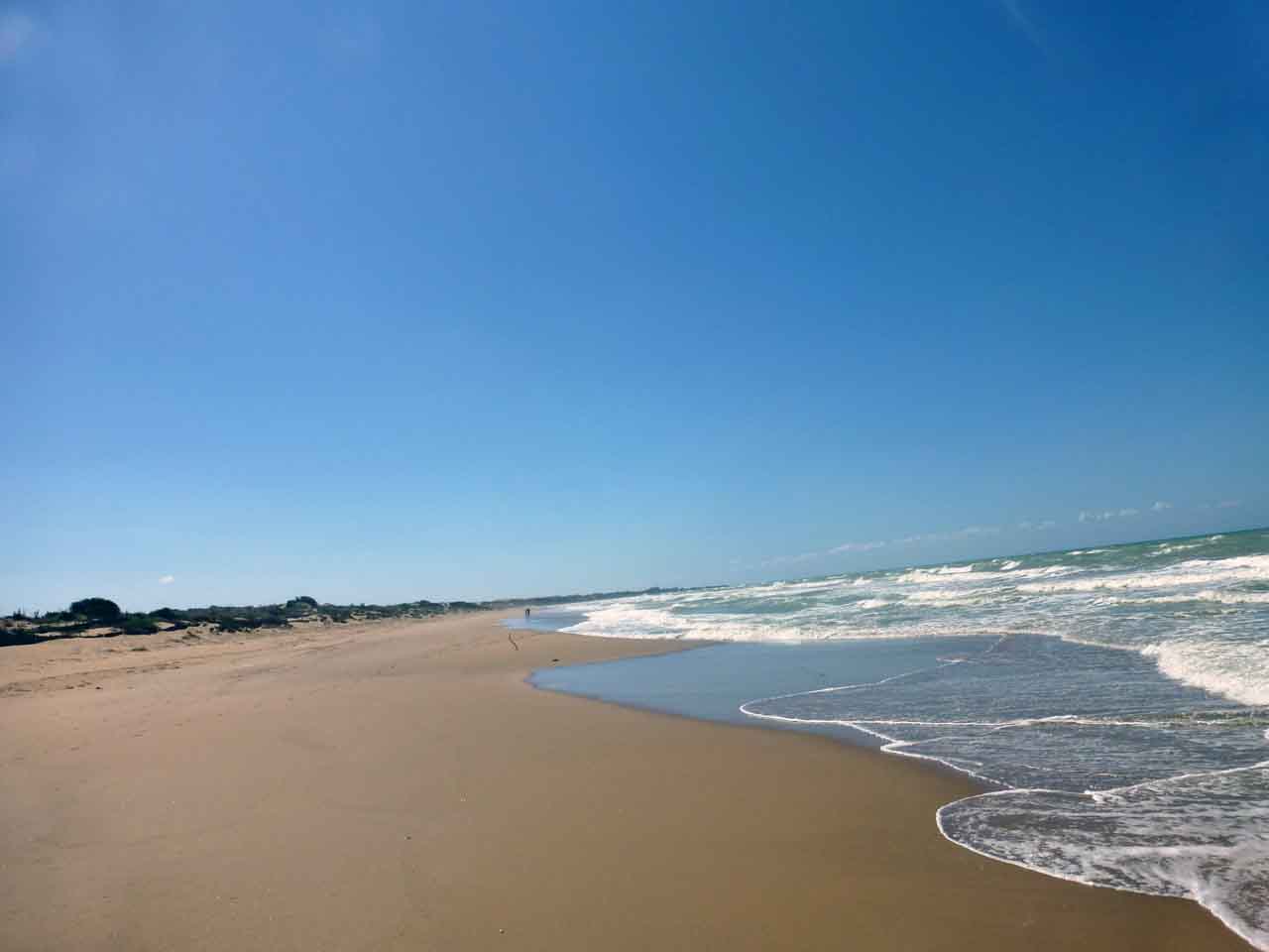 Der Strand ist 3 km lang, feinsandig, fast menschenleer. Das Wasser schimmert türkisgrün.