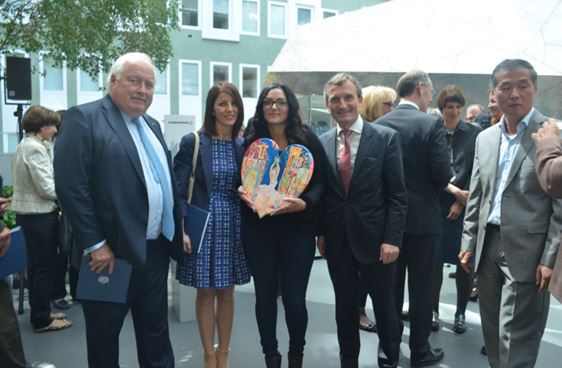 von links: Friedrich G. Conzen (Bürgermeister), Nesrin Tuncay (Vize-Konsulin der Republik Türkei in Düsseldorf), Meral Alma (mit ihrem UNICEF-Herz), Thomas Geisel (Oberbürgermeister); am Bildrand rechts: Prof. Qi Yang (China)