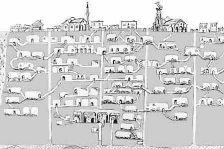 Es entstanden ganze unterirdische Städte mit Frischwasserzuläufen, Kirchen, medizinischen Operationssälen, Vorratsspeichern, Versammlungsräumen, Kerkern, Nekropolen etc., die von Archäologen seit den 1960er Jahren freigelegt wurden und heute besucht werden können. Die bekanntesten sind Derinkuyu und Kaymaklı. Weitere unterirdische Städte in der Region sind Ürgüp und Avanos .